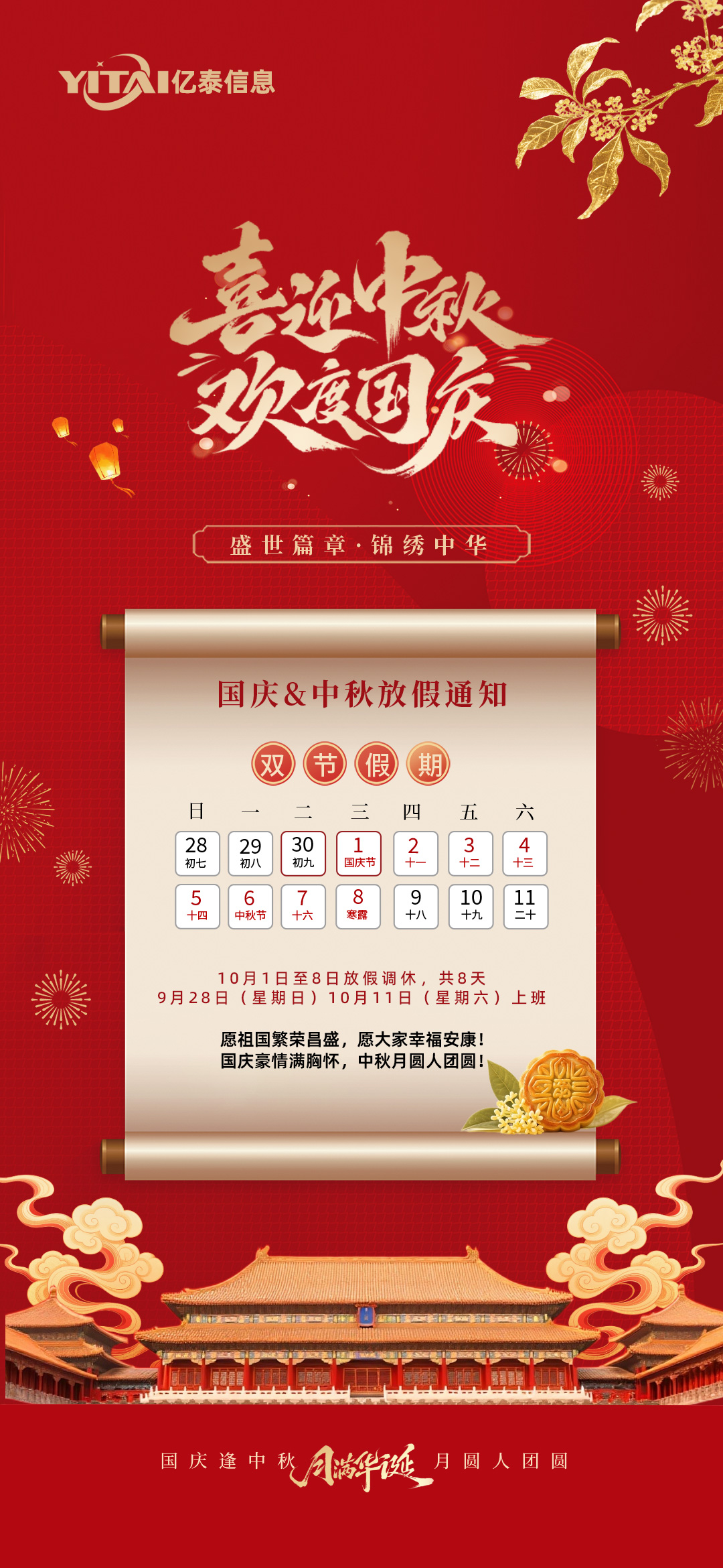 值此国庆、中秋双节来临之际,公司向全体员工致以最诚挚的节日祝福,愿大家与家人共度团圆祥和的假期。